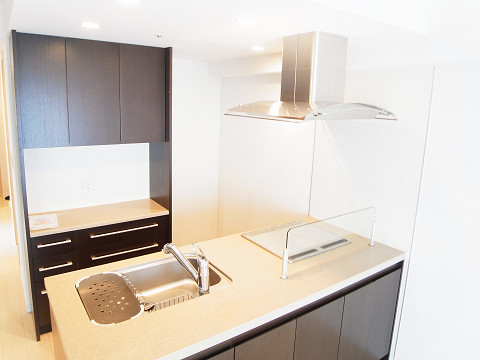 すぐ右手にキッチンがあります✿開放感溢れる対面式のスタイリッシュなキッチン。ダイニング側が収納になっているので、取り分け皿などを置いておくと便利ですね♪