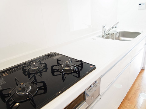 大きくとられたシンクや3口コンロを活用すれば、週末にホームパーティを開くこともできそう♬食洗機完備でお片付けもばっちり☆