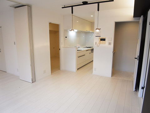 ホワイトでまとめられ、明るく爽やかなキッチンは通路幅が確保されているので、背面にカップボードも設置できそうです♡食洗機付きなので、後片付けも時短で済ませられますよ。