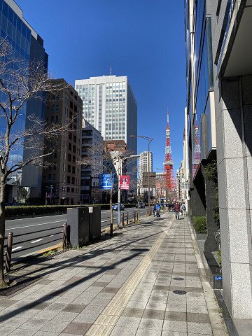 進行方向には日本のシンボル、東京タワーを望めます🗼歩道は広く、車道との間にガードレールもあるので安全です。