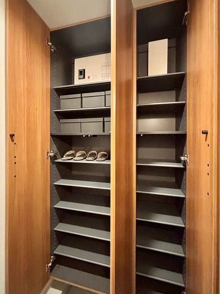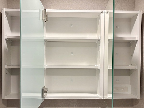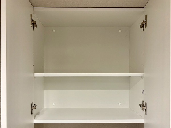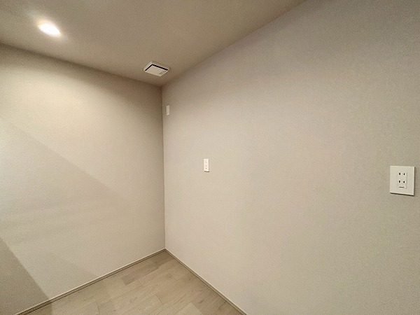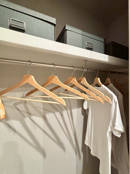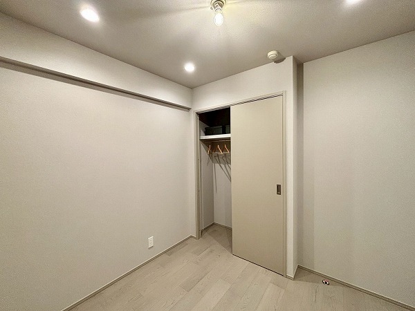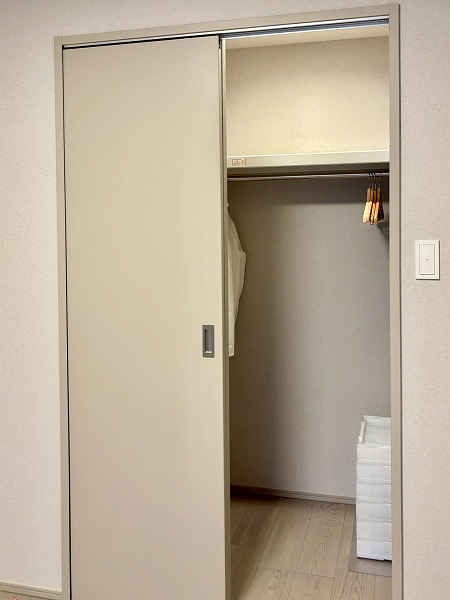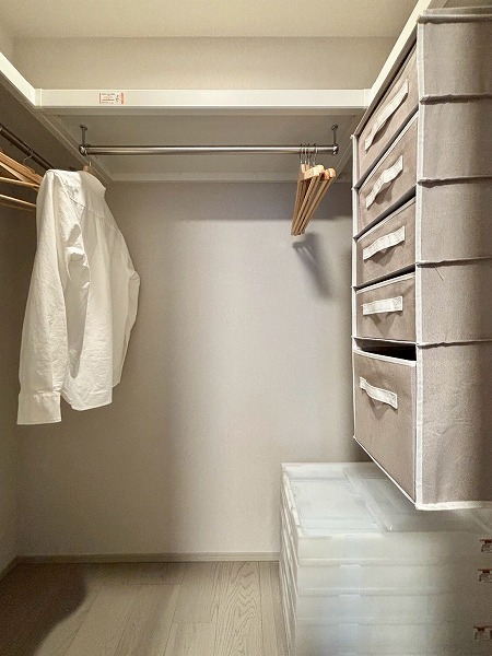 先ほどのおよそ5.0帖の洋室には、こちらのウォークインクローゼットが設けられています♪3面に棚板とハンガーパイプがあるので、たくさんお洋服をしまえますよ。扇風機や加湿器などの季節家電もこちらで保管できそうですね。
