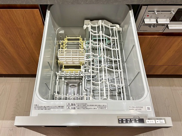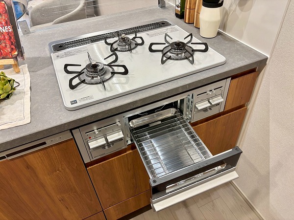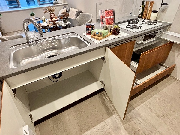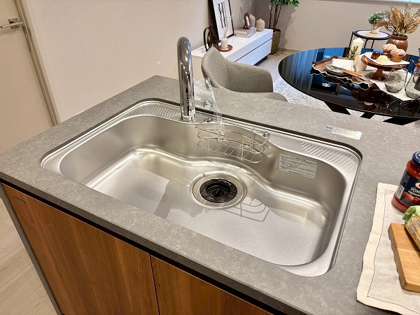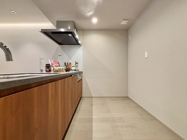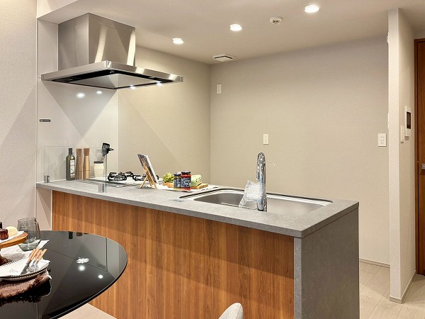 大理石調のカウンターが高級感を醸し出しているペニンシュラキッチン。フルフラットタイプなので、お料理をしながらご家族との会話を楽しめます。ディスポーザーや食洗機を搭載しており後片付けは楽々!背面には冷蔵庫やカップボードを置く余裕もありますよ。
