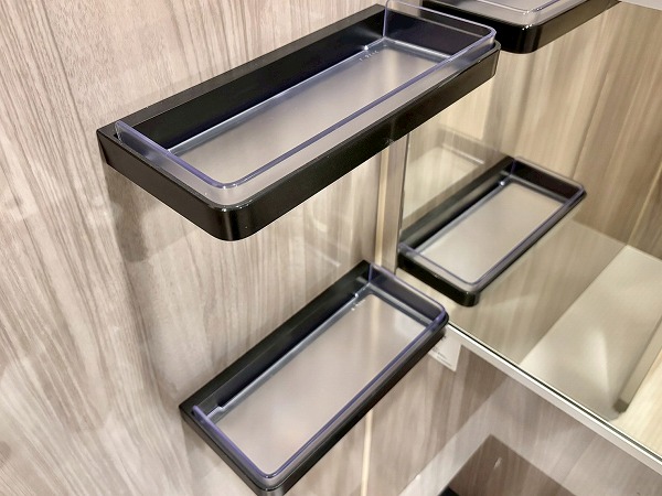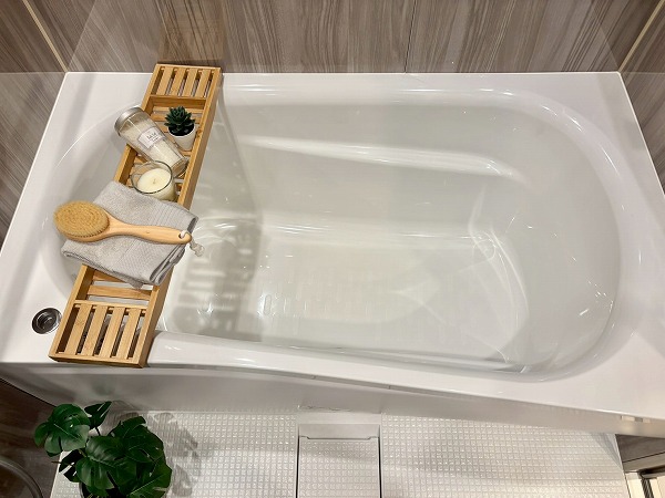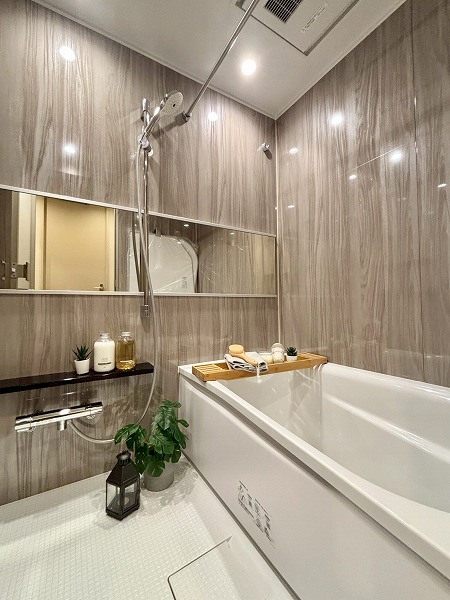 艶やかなブラウンのパネルが高級感を醸し出しているバスルームへ。少しゆとりのある1317サイズなので、お子様とご入浴する際も狭さを感じにくいはず。シャワー横のラックは中の板が取り外せるので、お掃除がしやすいですよ。