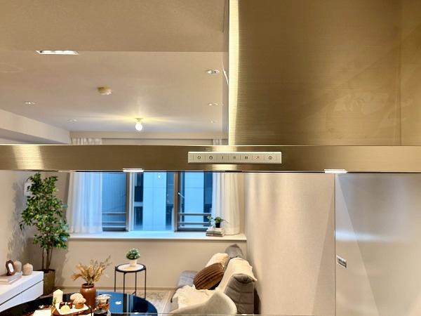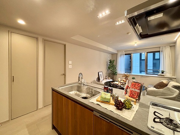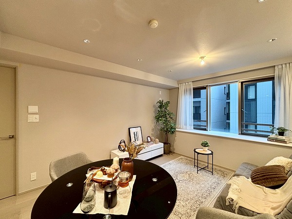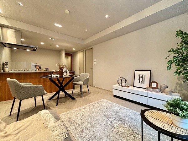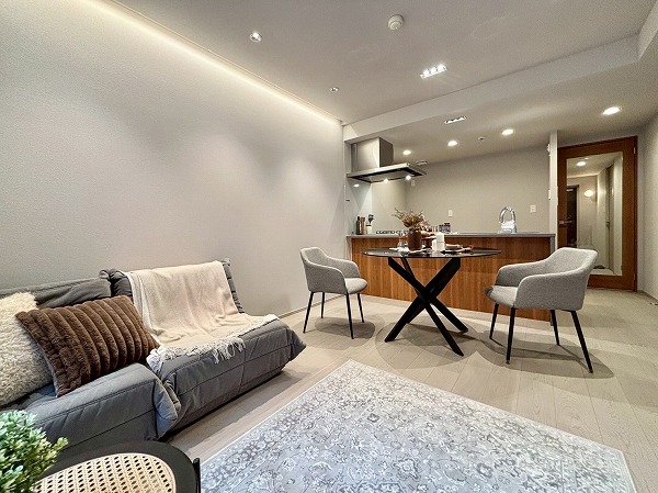 2026年1月に新規リノベーションが実施されたばかりなので、室内はどこも新築のように綺麗です。リビングダイニングキッチンはおよそ13.8帖。ダウンライトやコーニス照明がお部屋に明るさと奥行きをもたらしています。