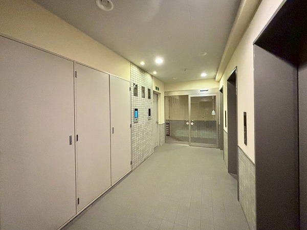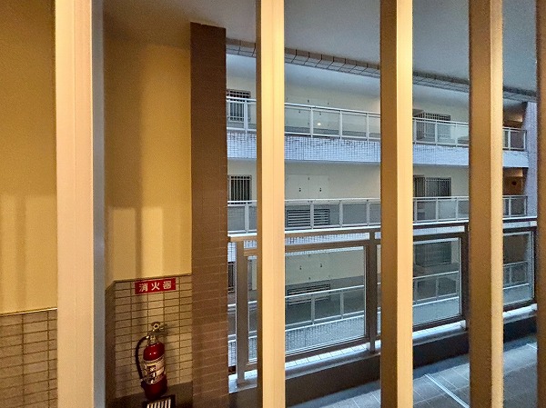 私が特徴的だと感じたのは居住フロアの造りです。エレベーターを降りるとお部屋によって道が二手に分かれており、それぞれにダブルオートロックが備わっています。吹き抜けになった外廊下も反対側に通り抜けられないようになっていて、行き来できる人がかなり限られた構造と言えます。