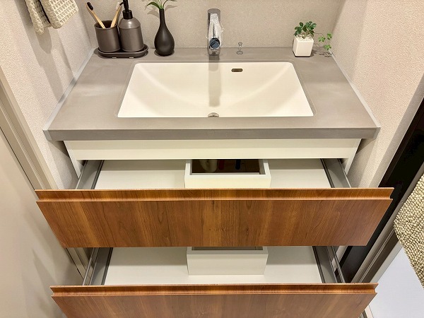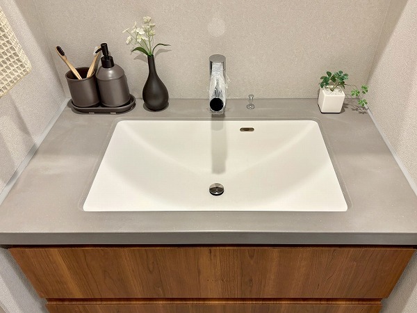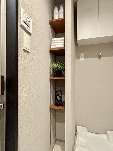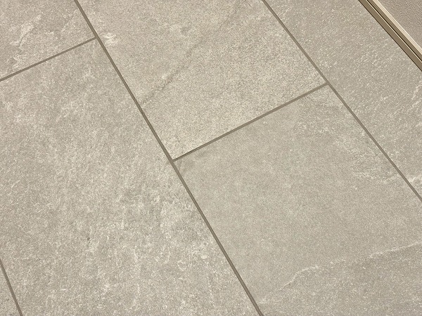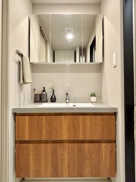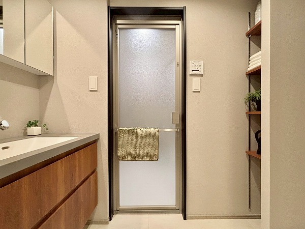 洗面化粧台と洗濯機置き場、リネン庫、バスルームがパウダールーム内にまとまっています。色合いはシンプルですが、床面のタイルや洗面台のカウンターの素材などにこだわりを感じるオシャレな空間です。お洗濯やお掃除がしやすく家事動線の良い造りですね。