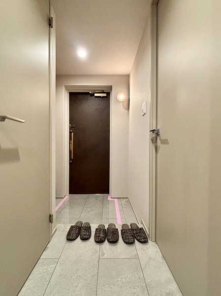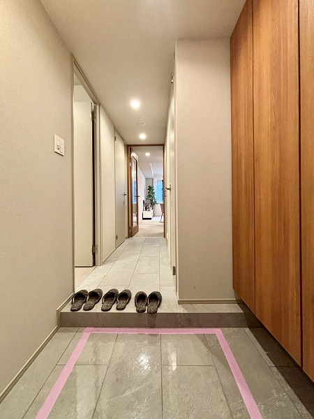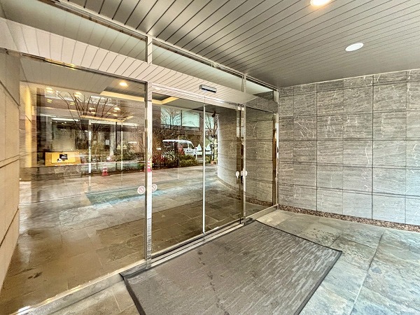 重厚感のあるエントランス。マンション名が印字されたカーペットが、このマンションの格式の高さを物語っています。オートロックと管理人室、防犯カメラが備わっており、24時間有人管理。住民の安心安全な暮らしを守ります。