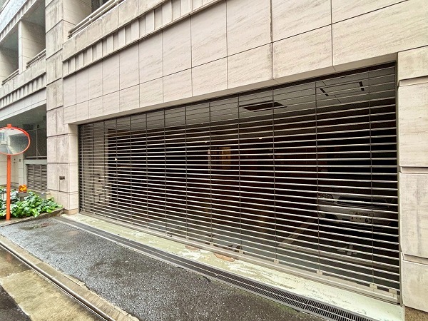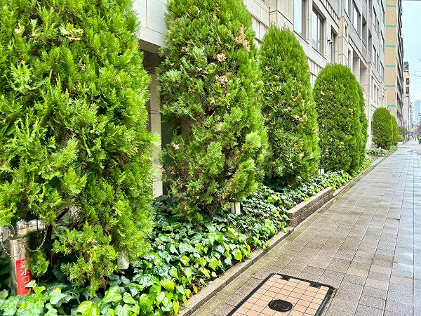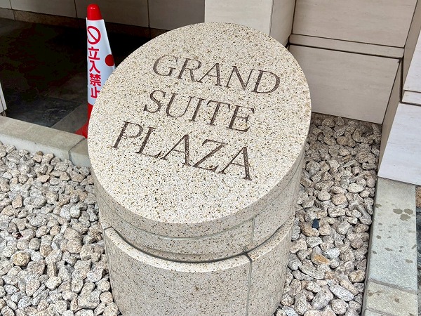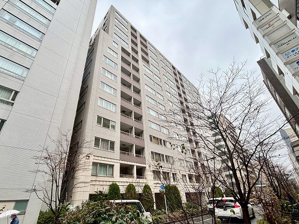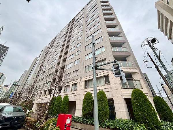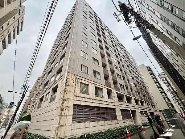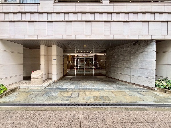 タイル張りでラグジュアリーな雰囲気漂う『ファミール日本橋グランスイートプラザ』。丸紅株式会社旧分譲、地下1階付き地上14階建て、総戸数194戸のビッグコミュニティです。マンションを囲むように綺麗に手入れされた植栽が植えられていました。