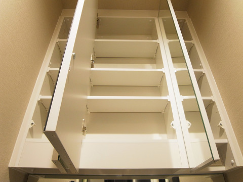 まずはサニタリールームをみてみましょう★洗面台はミラーキャビネット仕様で整理整頓しやすく、すっきり清潔に保てます♪洗濯機置き場の上には吊り棚がありますよ(´ω`*)