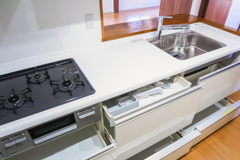 半独立タイプのキッチンは、ワークトップ、シンクともに広々としています。収納面においても満足できるサイズだと思いますよ(^ ^)