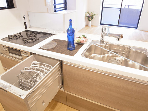 リビングの一角にはセミオープン型のキッチンを搭載。開放感たっぷりの所でお料理するのは気持ちが良いですね☆ビルトインタイプの食器洗浄機が備わっています♪