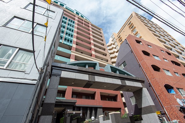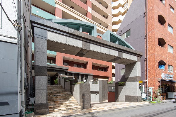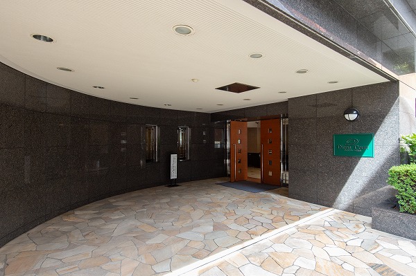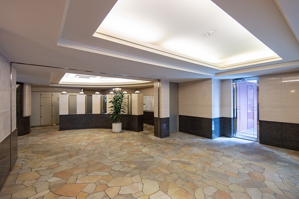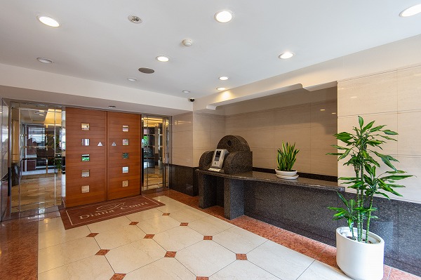 ブラウンを基調とした外観に、アクセントのブルーが上質な存在感を添える『ディアナコート恵比寿』。総戸数110戸の大規模レジデンスとして、街並みに落ち着いた風格を放っています。エントランスアプローチには石材が贅沢にあしらわれ、重厚感のある佇まい。ゆるやかな階段が外から室内への移ろいを自然に演出し、住まう人を静かに迎えてくれます。