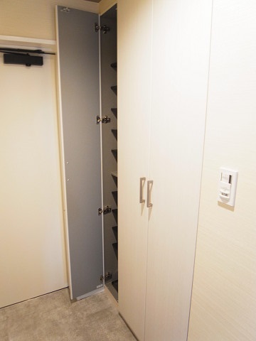 玄関の左側一面はシューズボックスです。高さのあるヒールやブーツも収納ができるスペースがあり、たっぷりと収納ができそうです(*^^*)