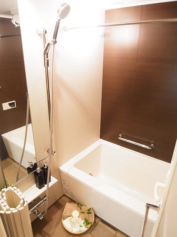 ダークブラウンのパネルを使ったバスルームは、重厚感があり自慢したくなってしまいます★手すり付きで優しいつくりです(/ω\)