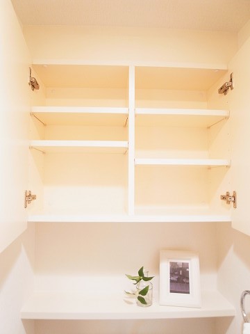 ウォッシュレット付きトイレの上部には吊り棚が設置されているので、隠しておきたいトイレ用品をしまっておけますよ(‘◇’)ゞ