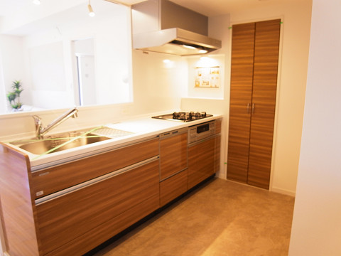 まずは右手の大型システムキッチン♡柔らかな色合いのデザインで、3口コンロと大きなシンクが採用されています♬ますますお料理もはかどりそうですね(≧▽≦)