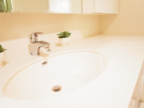 左側はパウダールーム。こちらも白で統一され清潔感があります。トイレが同じ空間にあるので、1人以上で住む場合は少し気を使ってしまいますね・・・。その分トイレはタンクレスですっきりと、空間は広々としています。ドラム式洗濯乾燥機内蔵です。