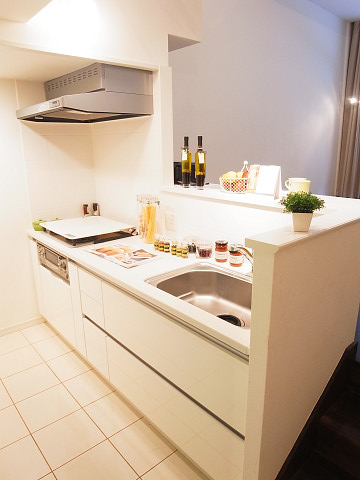 こちらもホワイトで明るい雰囲気。広すぎず、狭すぎずちょうど良いスペースです。カウンター付きで、リビングの様子も伺えます♪3口ガスコンロ完備。