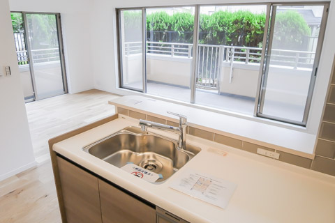 いよいよリビングダイニングへ。キッチンは対面式で、ワークトップが広くとられています。食洗機があるのも大きなポイントですね。