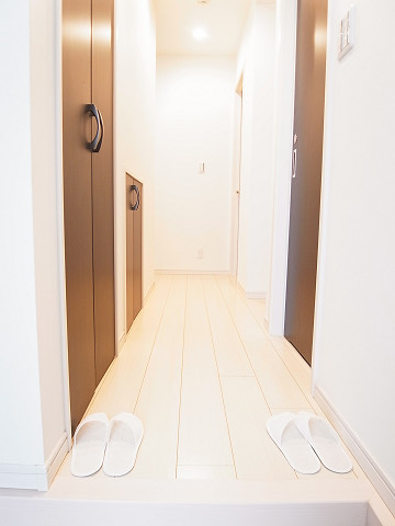 明るい室内。上がり框がしっかり設けられた玄関や、ダウンライトに照らされた長く続く廊下が、家に帰ってきた安心感を余計に増してくれます。