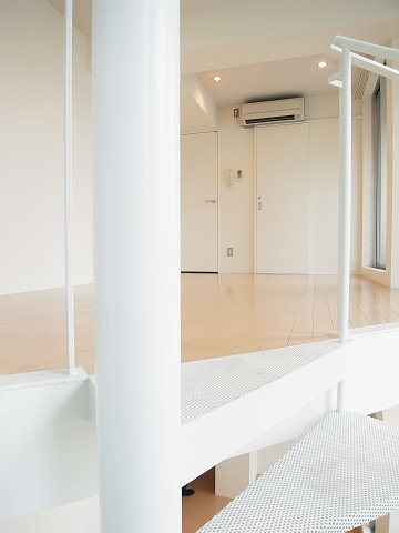 お部屋の雰囲気にピッタリと合った線が細く真っ白なスケルトン階段は、とても控えめなフォルムながら、しっかりとその存在感を発揮しています。デザイン性は抜群ですが、小さなお子様はくれぐれも気を付けて下さいね(>人<)