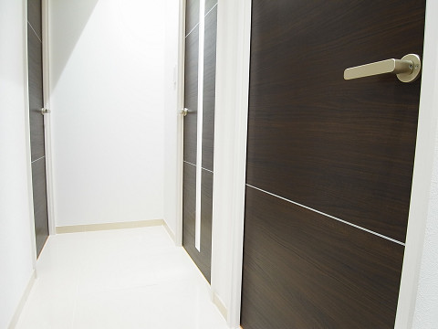スッキリとした空間を作ってくれている高低差のある2種類のシューズボックス。廊下にはエコカラットを使ってシンプルな中にもアクセントを利かせています。
