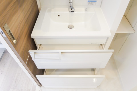 洗面台は扉一枚分のスペースにうまく収まっていますが、ボウルはかなり大きめ。収納のバリエーションが多いのもポイントです。
