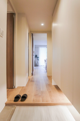 今回ご紹介するのは、3階部分にあるペットの飼育が可能なお部屋です。玄関から廊下にかけて、広さに余裕がありますね。シューズボックスも大容量。
