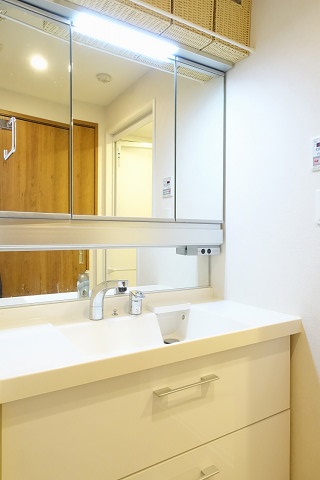 サニタリールームには三面鏡の大きな洗面台があり、毎朝の身支度がスムーズにできそうですよ☆サイドにあるリネン庫もパッとタオルが取り出せるので便利ですね(‘ω’)