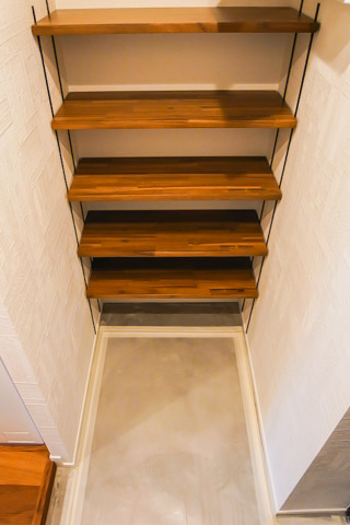 今回ご紹介するのは、5階部分にあるペットの飼育が可能なお部屋です。玄関先には専用のポーチが設けられていますよ。シューズボックスにオイルで色付けをした木材を採用し、おしゃれ度はかなりのもの。