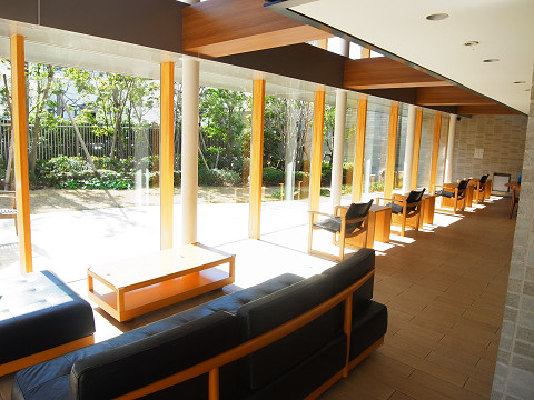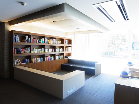 共有部はシンプルな造りで、鏡張りが嬉しい図書館、ラウンジ、お庭が設備され、とても明るく落ち着いた空間の印象でした☺