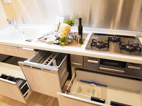 右手にあるのはシンプルなデザインのシステムキッチン(∩´∀`)∩3口コンロに大きなシンクが採用されていて、お料理もはかどりそう♬食洗機&浄水器一体型水栓付きで実用的です✨