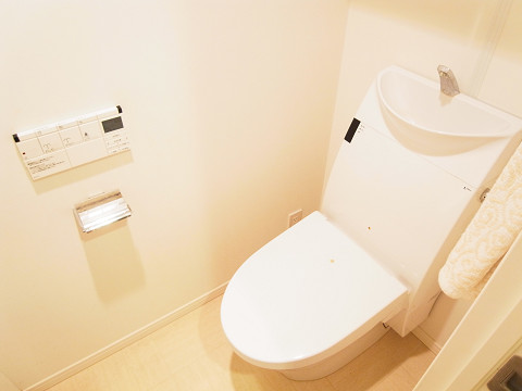 トイレは飽きのこないシンプルなデザイン(^^♪お手入れしやすいフォルムでいつでも清潔に保てますね♡トイレ用品は吊り棚におまかせ( *´艸`)