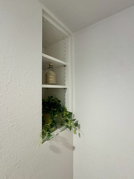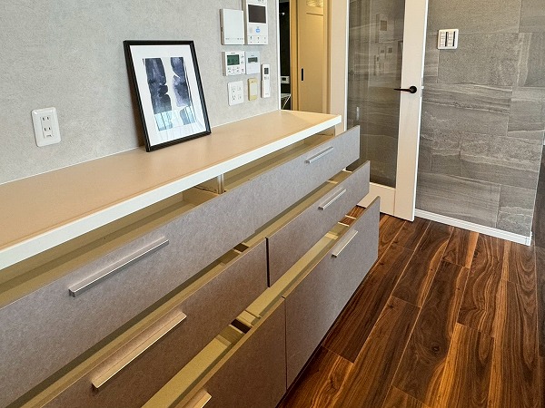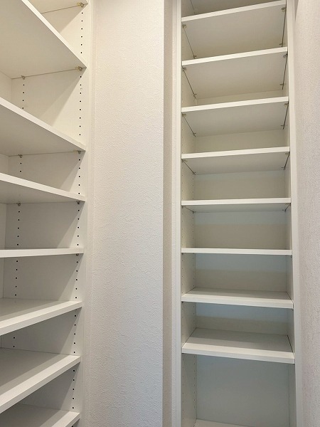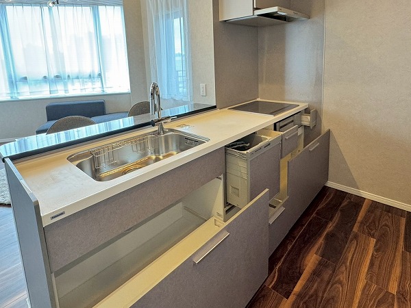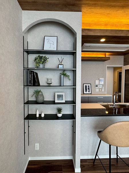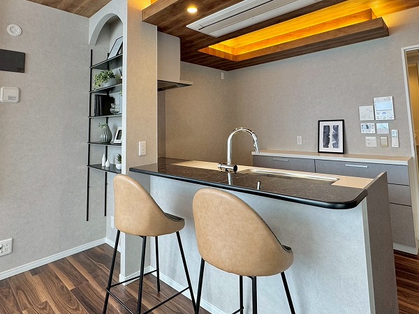 キッチンにはカウンターが備わっており、料理をしながらご家族との会話を楽しめます。生活がさらに豊かになりそうです。カウンター横の棚は可動式となっており、用途に合わせて幅を変えることができますよ。