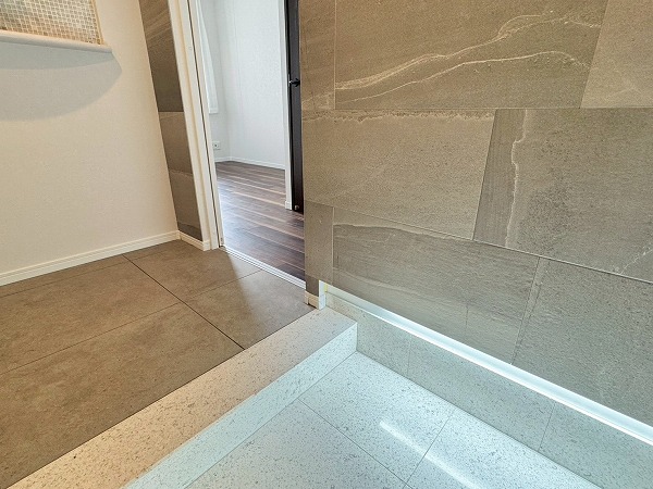 玄関は広々としたスペースで大人2人揃って靴の脱ぎ履きができそうなほど。玄関横にはシューズインクローゼットがあり、たくさんの靴を収納できます。白いタイルにフットライトが上品で高級感を演出していますね。