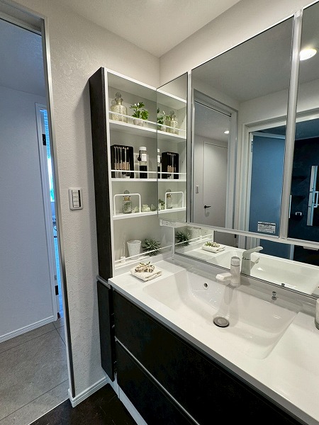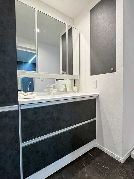 サニタリールームには洗面台・洗濯機置き場・バスルームが集結。水回りの機能がまとまっていると、家事動線がスムーズになりますね♪広々とした洗面台の鏡と明るいライティングで身だしなみを簡単に整えることができそうです。収納がたくさんのあるのも嬉しいですね!
