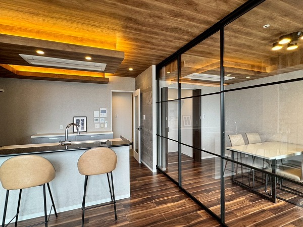 約15.1帖のメインルームは大きなコーナー窓がありスッキリとした印象です。また、隣の洋室との透明なガラスのパーテーションを開けると約20.1帖の広さになり、さらに開放感を感じる事ができます。ガラスのパーテーションはデザイン性があり素敵ですね。