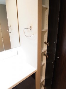 シューズインクローゼットとは別に、飾り棚を兼ねた収納もあって、とても使いやすそう。続いてはサニタリールームへ。