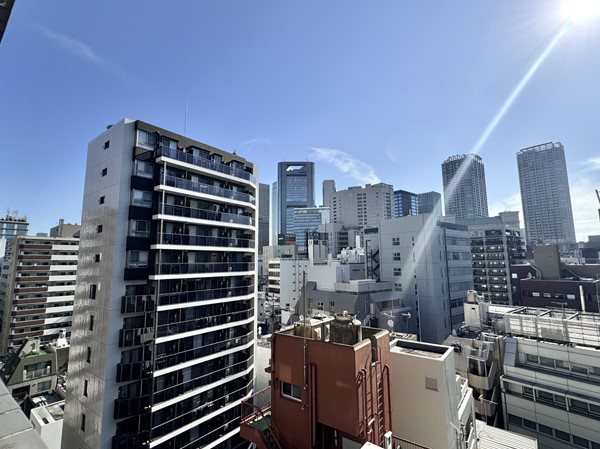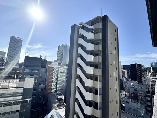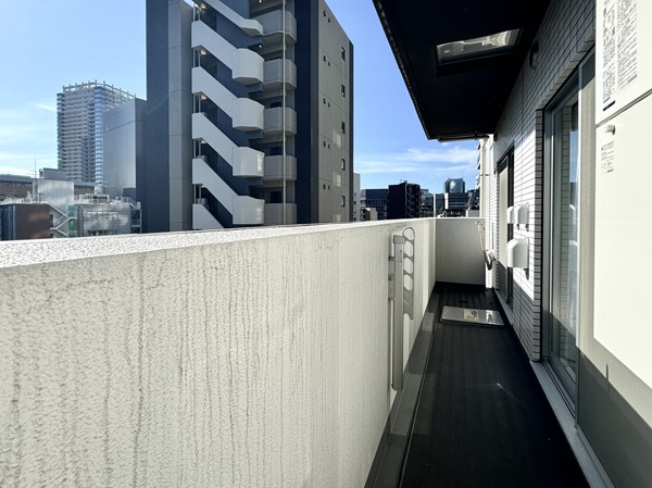バルコニーはメインルームと約5帖の洋室からアクセス可能となっており、広々とした横幅が設けられています。建物が林立する都会的な立地ですが、バルコニーの正面には密接した建物が無く空が開けた清々しい空間でした。