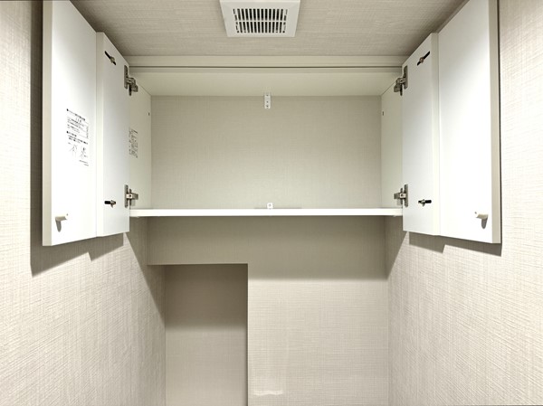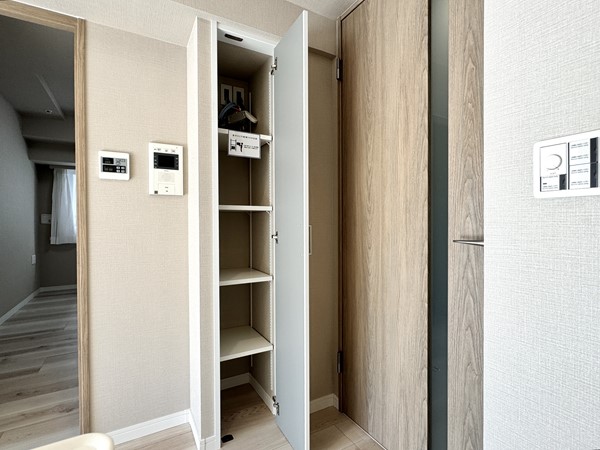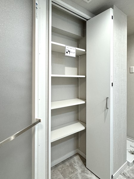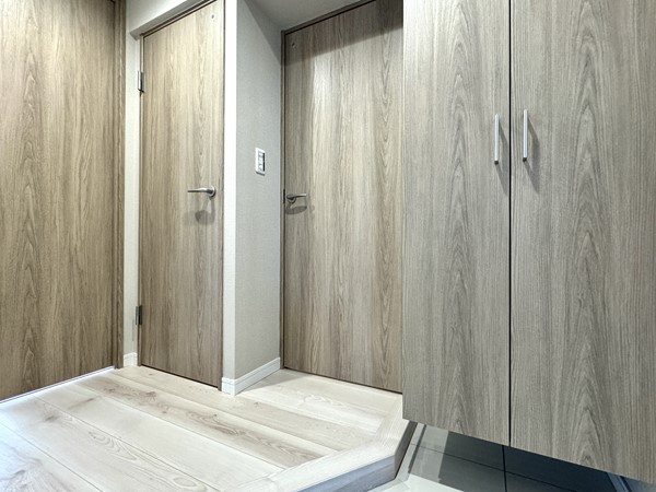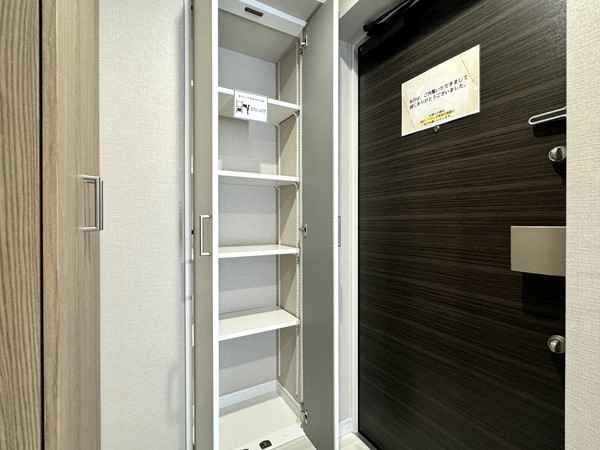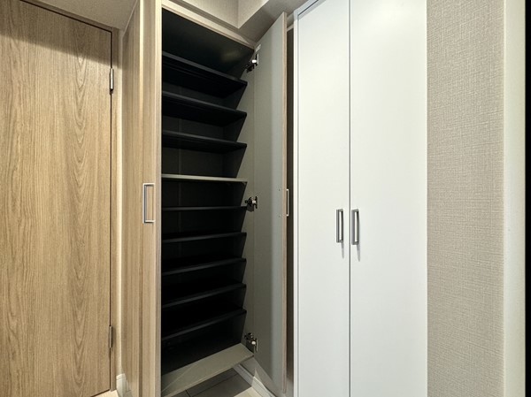 玄関には2つの背の高いシューズボックスが完備されていました。入ってすぐ右手の白い観音開きの収納は、棚板の高さが自由に調整可能となっており収納したいものに合わせて効率良くスペースを活用できそう。靴以外にも防災用品や掃除道具を収納するのにも適しているのではないでしょうか。