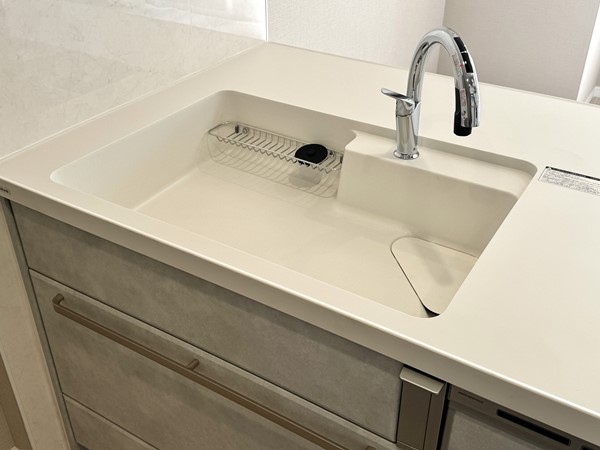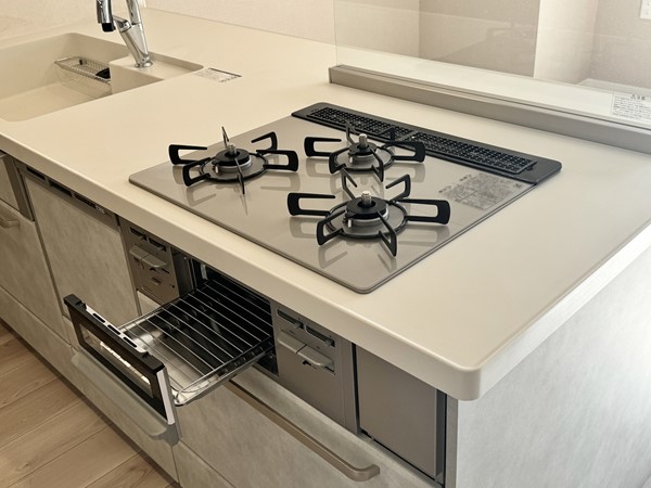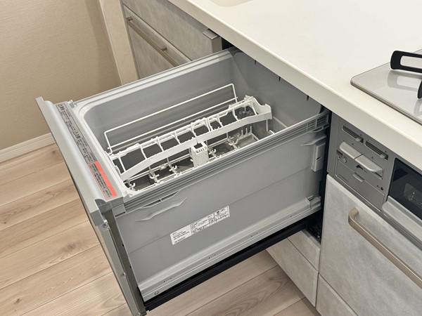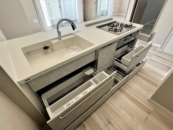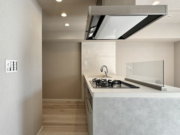 キッチンの対面側は全て扉付きの収納となっていました。食器や日用品を収納しておくのにピッタリの空間ですね。キッチンの背面にはゆったりと空間が設けられ、冷蔵庫やカップボードを設置することが可能です。