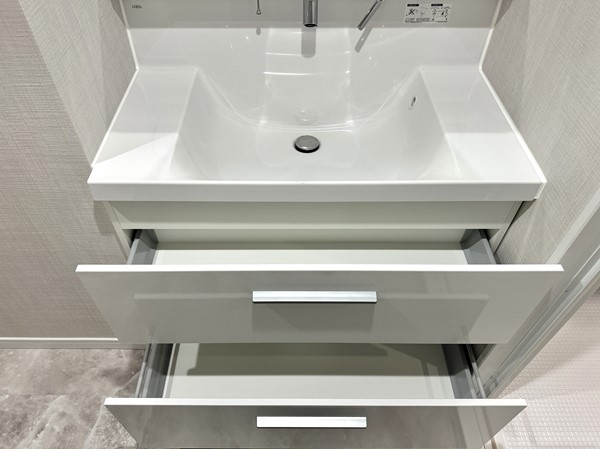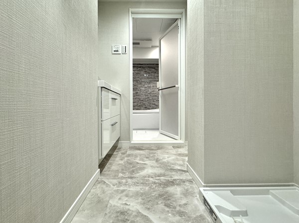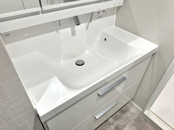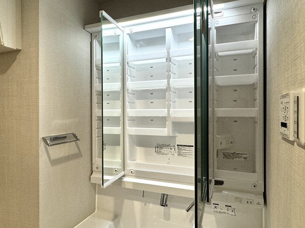 パウダールームには洗面化粧台、ランドリー、バスルームが集結。玄関に入ってすぐ右手に位置しているので、帰宅してすぐに手を洗うことができて衛生的ですね。ホワイトで清潔感のある洗面化粧台には、合わせ鏡としても活用できる便利な3面のミラーキャビネットを採用♪