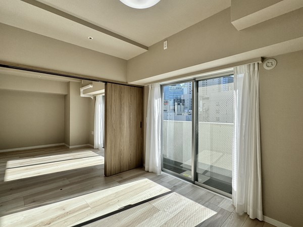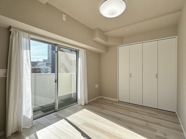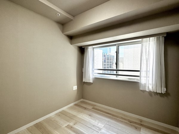 2つある洋室はいずれのお部屋もメインルームから入室可能となっており動線が優れています。こちらは約5帖の洋室。大きな窓があり自然光がたっぷりと降り注ぎます。