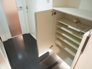 左手には大きなシューズクローク。シューズ用というより、物置として活用できそうです。廊下を進んだ右手に普段使い用のシューズボックスがあります。
