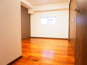 靴を脱いでお部屋に上がりすぐ左の扉を開けると専用バルコニー付の7帖のお部屋。2面に窓があり風通しのいいお部屋ですが、バルコニーのある東南側は隣の建物と隣接しているので視覚的には少し圧迫感を感じるかもしれません。