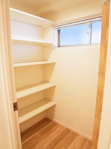 リビング入り口の両側には大きな収納があります。キッチン寄りにあるのは奥行きのあるパントリー。カップボードなどを置くスペースは十分にありますが、日持ちする保存食などを見やすくしまうのに活躍してくれそうです☆リビング寄りの収納はパントリーよりひとまわり小さめサイズになります。