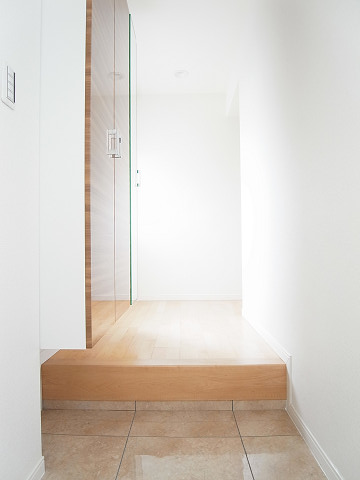 段々になった台は見た目と実用性を兼ね備えています。靴を履くときに手荷物を置くだけでなく、腰掛としても利用できそうです+.゚(*´∀`)b゚通路のように続く玄関を進むと光の入る廊下へたどり着きます。右側には大きなシューズインクローゼットを完備☆