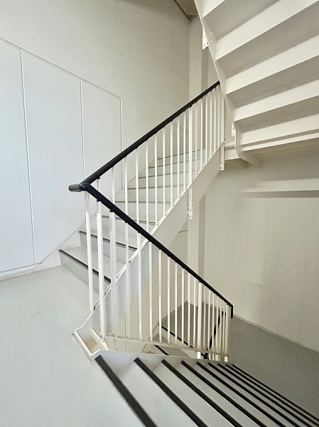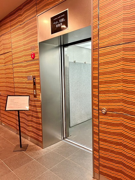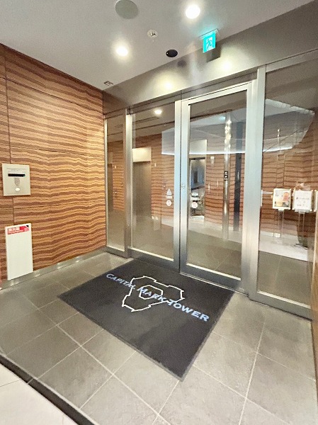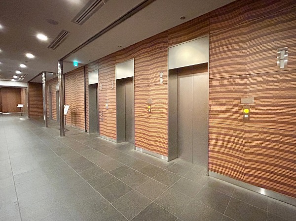 オートロックを抜けた先に広がるのは、水の流れるメインエントランス。中央の光の階段が存在感たっぷりに出迎えてくれました。居住フロアへ向かうエレベーターホールに向かうには、ダブルオートロックを解錠する必要が。