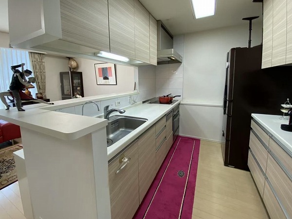キッチン前面にはカウンターがあり、配膳や後片付けをスムーズにしてくれます。カウンター下にはガラスが用いられた高級感あるキャビネットが。日用品のストック置き場などにピッタリです。
