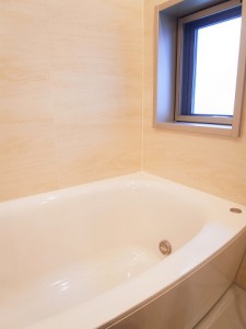 スケルトンの扉になっているバスルームは開放感がありアクセントカラーにブラックが使われています。小さな窓はお風呂の換気や空気の入れ替えにも便利です!